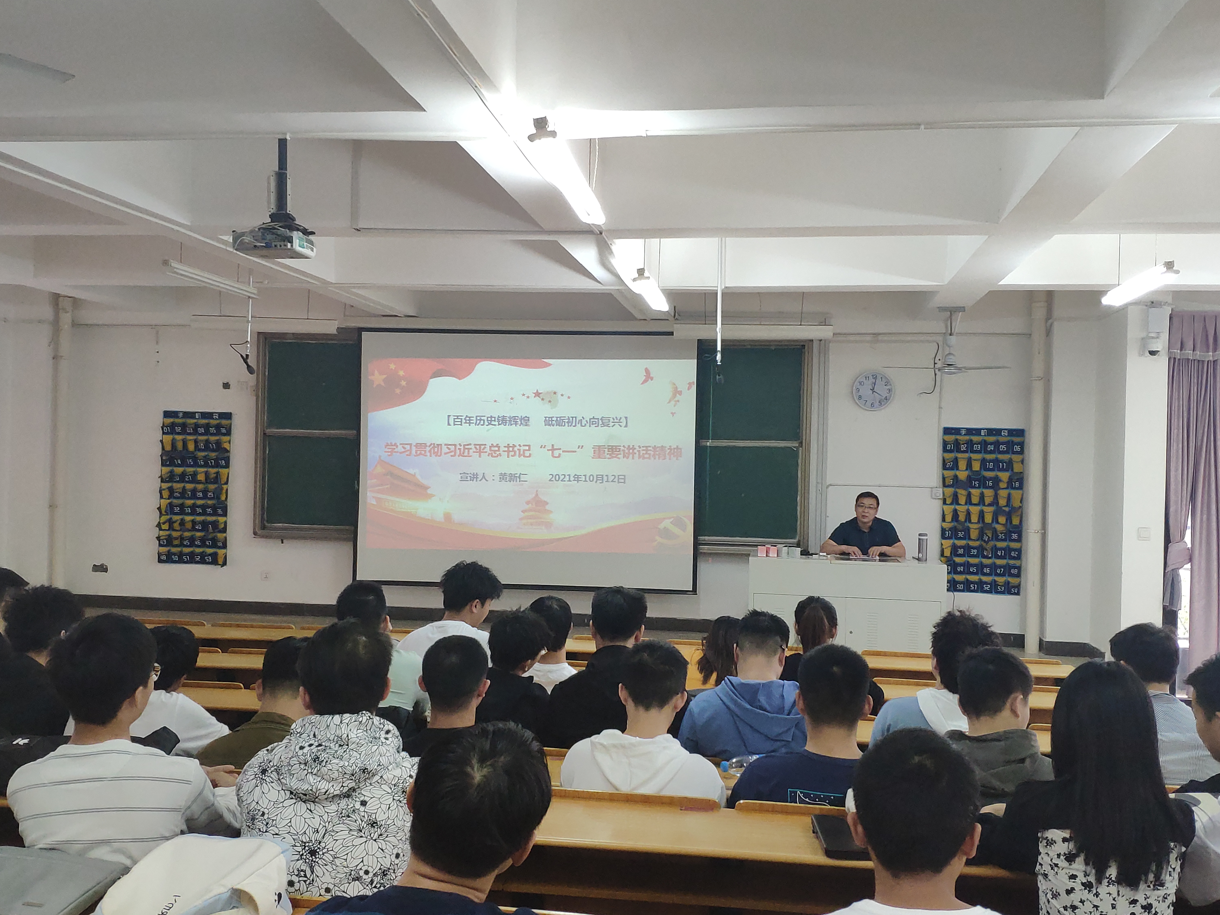 黄新仁老师首先从习近平总书记在讲话中的“一个目标”“一个主题”进行切入,深刻阐述了“四个伟大成就”“伟大建党精神”“九个必须”,接着对“七一”讲话精神的历史意义、时代意义、理论意义、实践意义进行讲解,让同学们对“七一讲话精神有了更深刻的了解。最后,黄新仁老师就“七一”重要讲话精神对同学们寄予殷切期望,希望“青年一代有理想、有本领、有担当,国家就有前途,民族就有希望,中华民族伟大复兴才能在一代代青年的接力奋斗中变为现实!”
